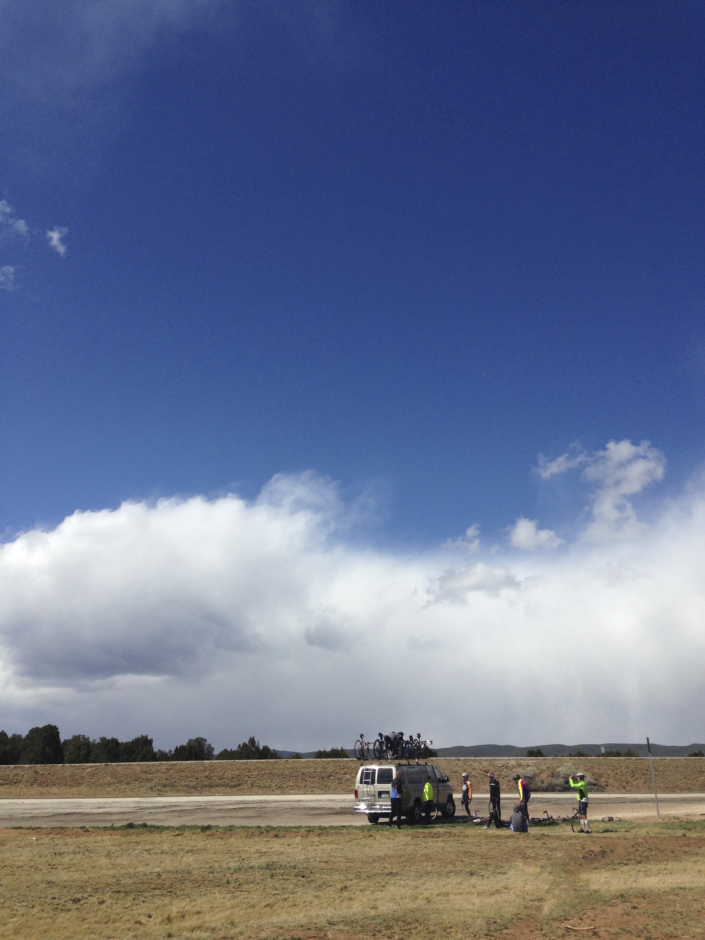 Another day curtailed by dangerously strong cross winds that threatened to dump us on the black top at any moment. Managed to ride 114 miles before Mike Munk (tour leader) called a halt. One of the two Kiwi riders, Symon, took a heavy fall after getting his front wheel caught in a cattle grid and was taken to hospital to clean up his face and shoulder. Pictures of the battered and bruised All Black front row tomorrow! His helmet looks like a bite’s been taken out of it. Probs saved his life. Always wear one – you never know when you’re going to need it.
